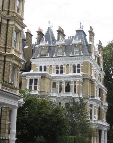 The feature I love the most about the houses on the upper left were those beautiful medallions above the porches; at night they glowed from the porch lights within them and were even more impressive. The house on the lower left has one of the famous blue plaques on it, (which you might not be able to see at this resolution, but check the full-sized version in Flickr) this one for W.S. Gilbert, who gave the world the "model modern major general," the "gay and gallant gondolieri," and so much more delightful nonsense. The handsome house on the right is in a fashionable near-Hyde-Park neighborhood and I'd rather not know how much it would cost to live there—it would spoil the fantasy.