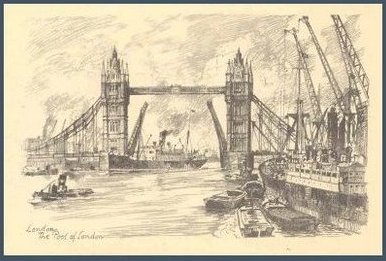 The picture on the right of the Tower Bridge was scanned from a postcard my father sent to my mother while he was stationed in England during World War II. It shows a very different view of the Bridge's environment than what I became familiar with during my stay in London. (I was so taken by this postcard that I used it as the title graphic for my London blog; if you like old postcards and want to see more of the cards Dad sent from England, click here.) The many wharves and docks that had congested the Upper Pool, from London Bridge to the Tower, which were so vividly depicted in the latest Sherlock Holmes incarnation, have been replaced with pleasant embankments and upscale office and residential space. But the Tower Bridge remains an elegant and powerful symbol of London. |