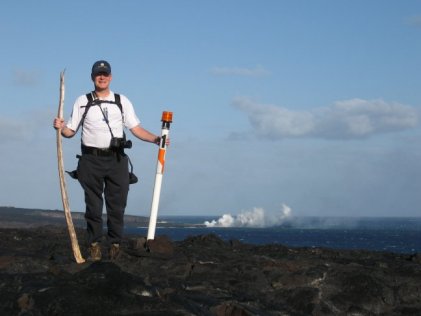 The first part of the hike is well-marked, with the little yellow reflective tabs that you can see in the picture on the left below. After that, though, you're on your own to blaze a trail, guided only by a series of beacons (about 7 or 8; Kathy made it to the 5th one before turning back) that are spaced about a quarter of a mile apart. On the right below is Henry at #1. The beacon behind you and the beacon ahead are usually visible as you clamber over the broken lava. But the sun and the steam from the vent are other good navigation markers during the daylight. After dark, the blinking lights on the beacons are all you have.