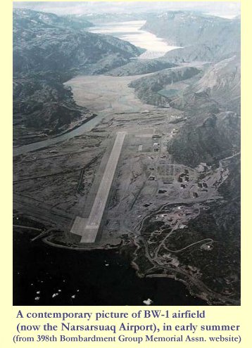 [6] The airfield at BW-1 is now an airport, Narsarsuaq, serving southern Greenland. We think Billy visited, or at least flew over, this site after the war; click here to see some pictures of the site, and more information about it.