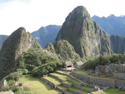 Here are two more photos taken from the high Sacred Plaza. The one on the left looks across the plaza at one of my favorite Machu Picchu features: a large rock formation that the Inkas made part of their striking landscape design, rather than dismantling it and replacing it with something else. This was a hallmark of their architectural style. In the other picture, the two huts you see in the distance are the wayronas where Joan and Kathy waited for Henry to come back from his Waynapicchu climb. We saw a group of llamas put on quite a show rolling in the dust there!
