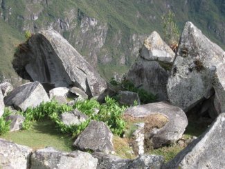 On the left below and the upper right we have the sector known as the "quarry." This is where the Inkas worked on stones to be used elsewhere in the complex. Our guide told us that archeologists believe the whole site looked something like this jumble of boulders when the Inkas first found it and decided to build Machu Picchu here. I'm not sure if the photo on the lower right is of the quarry itself or just another area of jumbled rock. The lovely terraces below the boulders are all over this section of the complex and make great places for resting, meditating or picnicing.